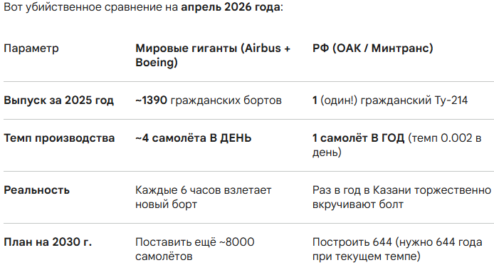 Чтобы собрать 644 борта к 2030 году, рф должна выпускать по ~180 самолётов в год. Но это вам не Боинг. Страна, которая не может наладить выпуск стабильной ABS для «Лад», обещает печь самолёты быстрее пирожков. Фактический темп сейчас — перенос сроков и полфранкенштейна в год для выставок.
