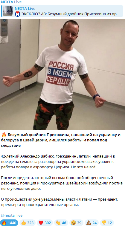 В поезде Интерлакен — Шпиц русскоязычный мужчина напал на украинку Елену Дудник, её мужа и годовалого сына, услышав, что они разговаривают на украинском.