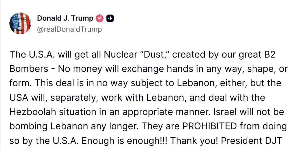 Исполняется очередное пророчество Трамп: США получат весь ядерный “пепел”, созданный нашими великими бомбардировщиками B2. Никаких денег не будет передано. Эта сделка не касается Ливана, но США будут отдельно работать с Ливаном и решать проблему с “Хезболлой”. Израиль больше не будет бомбить Ливан — это запрещено США. Хватит — достаточно. https://t.me/alexavni/145212 То-есть, США лишают Израиль суверенитета и объявляет вассалом. напоминание Даниэль 12 7. И услышал я, как муж, одетый в льняные одежды, что был над водами реки, подняв правую и левую руку свою к небесам, клялся Вечноживущим, что к (назначенному) сроку, к срокам и половине (срока), когда полностью сокрушены будут силы народа священного, закончится все это.… Read more »