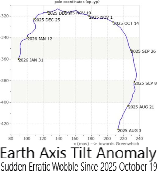 RE: Смещение потоков в смещающемся ядре Земли магнитно влияет на атмосферные и океанские потоки >> климатические аномалии. СO2 ни при чём. https://thebigtheone.com/до-сдвига-полюсов-остаются-месяцы/#comment-318086 . . К слову, вот еще сегодня, 1.2.26 увидел в Сети в тему: Прим.: Правда, этот John Traczyk списывает аномалии на некое внешнее влияние на Землю, — но, по любому, настораживает совпадение аномальных колебаний оси Земли с октября 2025 и погодных аномалий: 31.1.26. https://www.facebook.com/john.traczyk.908957/posts/pfbid05ET3aAeb4GZxtFiwXYnKJ3PK31f3RxqmYtKjcK9pi22A5XiXaLDPP445uXPpz1Pbl . MAJOR POLE SHIFT ALERT ! Earth Axis Tilt Anomaly – Sudden Erratic Wobble Since 2025 October 19. Folks, this is the rotation and axis tilt & wobble of Earth’s… Read more »