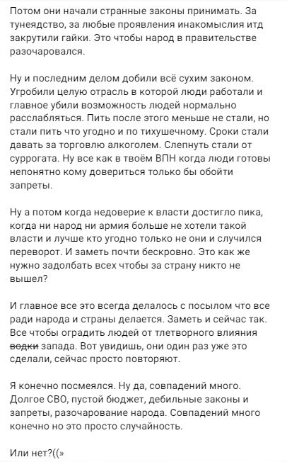 Автор поста сравнивает запреты в интернете с советским сухим законом и странными законами за тунеядство. Тогда у людей забрали алкоголь, а сейчас отбирают привычные сервисы под предлогом защиты от “тлетворного влияния Запада”.