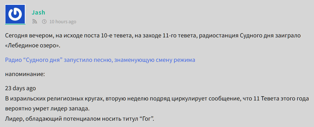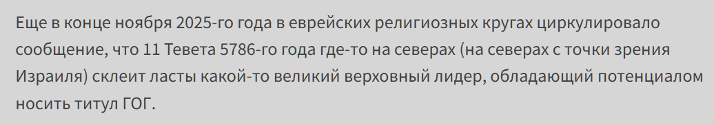 Еще в конце ноября 2025-го года в еврейских религиозных кругах циркулировало сообщение, что 11 Тевета 5786-го года где-то на северах (на северах с точки зрения Израиля) склеит ласты какой-то великий верховный лидер, обладающий потенциалом носить титул ГОГ.