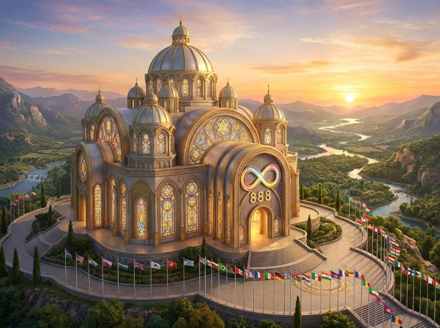 Храм на картинке – центр новой мировой религии – каббализма. Флаги на картинке – намёк на мировое правительство, которое будет управлять всеми странами из Иерусалима.