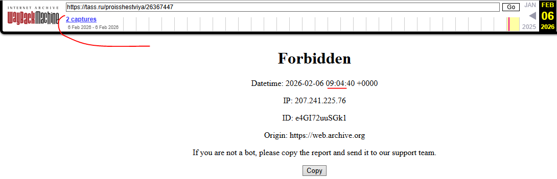 Вонючий Тасс защитился от всех 3 веб-архивов защитой от роботов, но Wayback Machine впервые отсканировал эту ссылку ещё в 09:04, за полчаса до 09:30.