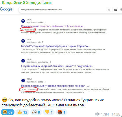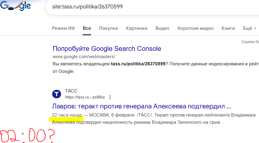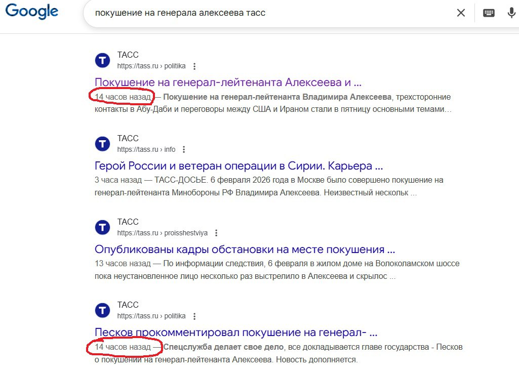 ТАСС может рисовать любое время на сайте, но поисковых роботов не обманешь. Google чётко зафиксировал появление страницы ещё вчера вечером. Получается, покушение по версии СК случилось утром 6-го, а новость о нем в поисковой базе была уже 5-го. Это не журналистика, это публикация сценария до начала спектакля».