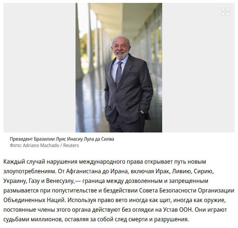 Бразильский президент-социалист Лула Да Силва жестко раскритиковал Россию за украинскую войну. В своей колонке в “Коммерсанте” он выразил мысль, что украинский кейс – “нарушение международного права”, которое “открывает путь новым злоупотреблениям”.