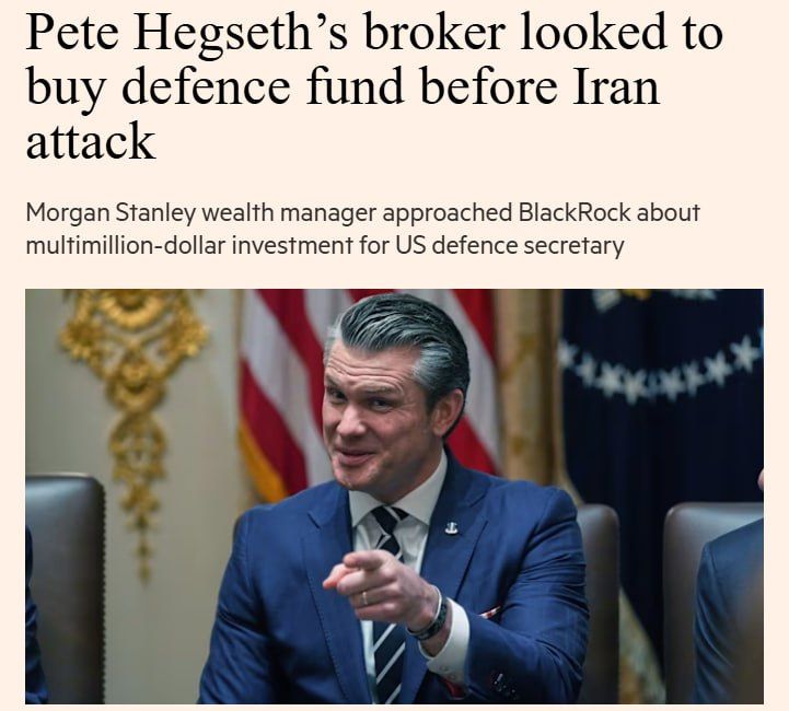 Любая война это бизнес. Брокер Пита Хегсета незадолго до начала войны в Иране хотел приобрести акции оборонных компаний на миллионы долларов — FT. .По словам трёх человек, знакомых с ситуацией, брокер министра войны США Пита Хегсета пытался сделать крупную инвестицию в ведущие оборонные компании за несколько недель до американо-израильского удара по Ирану. По словам этих источников, брокер Хегсета из Morgan Stanley связался с BlackRock в феврале по поводу инвестирования нескольких миллионов долларов в ETF Defense Industrials Active. После публикации статьи FT главный пресс-секретарь Пентагона Шон Парнелл написал: «Это утверждение полностью ложно и сфабриковано. Ни министр Хегсет, ни кто-либо из его… Read more »