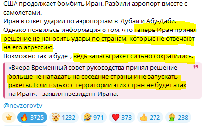 Таким образом, если посмотреть на все эти сообщения, то с Ираном всё – сопротивление аятолл сломлено, стратегические ресурсы уничтожены и осталось дело только за сухопутной операцией. А этим займутся соседи: курды, талибы, Пакистан и Азербайджан. Само собой Хузестан провозгласит независимость, а там практически половина иранской нефти, оазисы и вода.