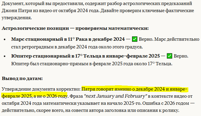 Как видите по оригинальному тексту, она произносит фразы “next January and February” (в следующие январь и февраль) и “in December” (в декабре). Учитывая астрологические позиции (Юпитер в 17° Тельца и ретроградный Марс в 11° Рака), это математически 100% относится к декабрю 2024 года и январю–февралю 2025 года.
