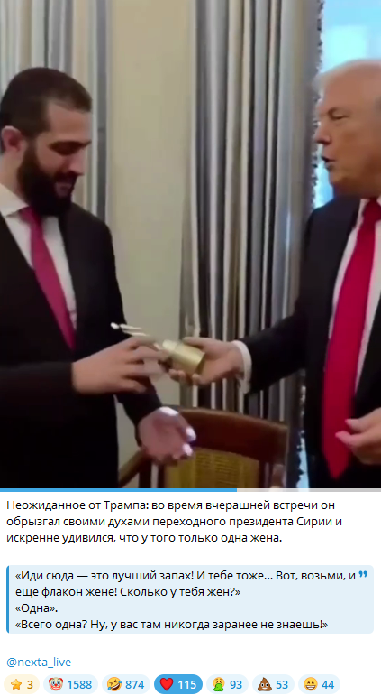 Пока руснявые помойки и iW(i)tch/айфоновские старцы рисовали нового президента Сирии смаху антихристом (потому что его борода немного похожа на бороду Зеленского, хи-хи как смешно!), Трамп подарил ему и жене по флакону духов.