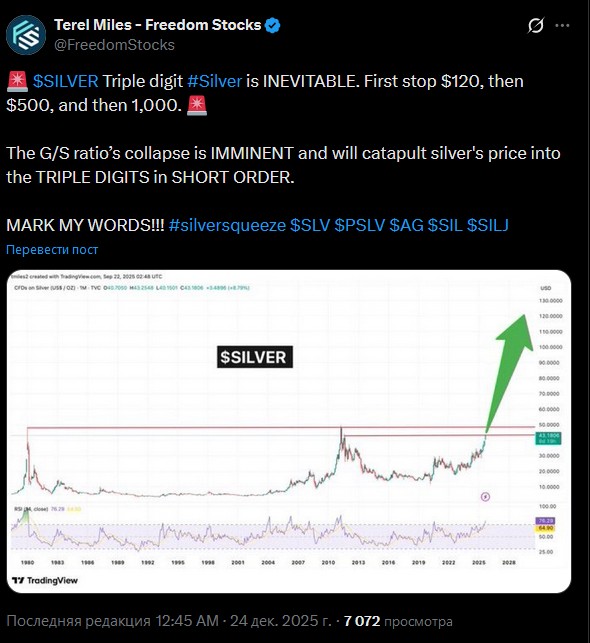 Естественно, на этом фоне половина где-то аналитиков вангует какой-то глобальный финансовый коллапс, когда все рынки и все валюты рухнут в одночасье. И мы придерживаемся именно такой точки зрения. Однако, другие и не менее умные люди вангуют, что пока коллапса не будет и серебру еще предстоит взлететь сначала до трехзначных, а потом и до четырехзначных цифр: