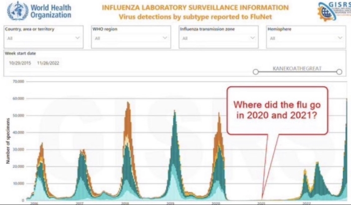Как можно видеть, сезонный грипп и шмурдяк – вещи несовместимые. Как только в мире начинается COVID-19, как только назойливые дистрибьюторы лезут, как тараканы изо всех щелей и предлагают лечение – так инфлюэнца сходит на нет, растворяется в ноль. В этом году инфлюэнца есть. Следовательно, COVID-19 нет.