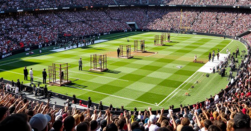 Большинство мест были заняты, а толпа собралась очень шумная и беспокойная. Игра еще не началась, когда на футбольное поле вывезли 10 эшафотов, расположенных с перерывами на каждой 10-ярдовой линии. Жертвы стояли каждая на своем эшафоте, а их палачи находились рядом и держали в руках пульты с кнопками, которые активируют выпуск гильотинами лезвий.