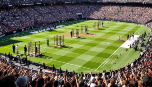Большинство мест были заняты, а толпа собралась очень шумная и беспокойная. Игра еще не началась, когда на футбольное поле вывезли 10 эшафотов, расположенных с перерывами на каждой 10-ярдовой линии. Жертвы стояли каждая на своем эшафоте, а их палачи находились рядом и держали в руках пульты с кнопками, которые активируют выпуск гильотинами лезвий.