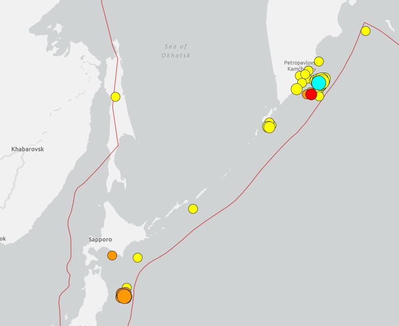 По данным USGS там было штуки четыре М6.0 и полтора десятка М5.0 +, что довольно много. Эпицентры распределялись по глубинам 30-60 км и сегодня там снова было несколько М5.0+, синхронно с Японией.
