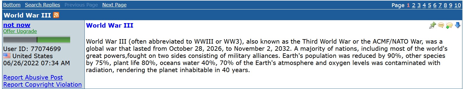 Третья мировая во*на (часто сокращается до WWIII или WW3), также известная как Третья мировая во*на или во*на ACMF/NATO, БЫЛА глобальной войной, которая продолжалась с 28 октября 2026 года по 2 ноября 2032 года.