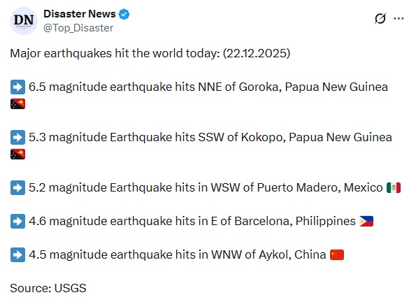 Сегодня в мире произошли крупные землетрясения: (22.12.2025) https://x.com/Top_Disaster/status/2003080691307925714