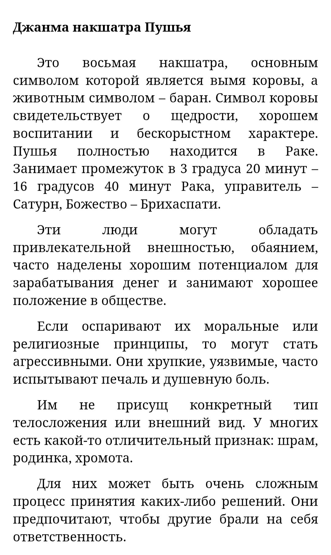 Конец Кали-юги и возвращение Калки: «Когда Всевышний Господь явится на земле как Калки, хранитель религии, начнётся Сатья-юга, и следующие поколения будут рождаться в гуне благости. Когда Луна, Солнце и Брхаспати (Юпитер) соберутся вместе в созвездии Карката (Рак), и все три одновременно войдут в лунный дом Пушья в этот самый момент начнётся эпоха Сатья. Господь Калки, Господь вселенной, сядет на своего быстрого белого коня Девадатту и с мечом в руке двинется по земле, проявляя Свои восемь мистических достояний и восемь божественных качеств. Сияя несравненным блеском, Он стремительно помчится на своем коне, убивая миллионы тех воров, что дерзнули рядиться в одежды царей». https://www.livelib.ru/book/1426934/readpart-neizvedannye-vedy-konstantin-savin/~4?ysclid=mjgr0mte4o161905997 Накшатра Пушья Это восьмая накшатра, основным символом которой является вымя коровы, а животным символом –… Read more »