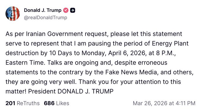 Вторник и среду, 24-25 марта, мир пребывал в тревожном ожидании нанесения удара по энергетической инфраструктуре Ирана, на что шииты обещали в ответ потушить свет во всех странах региона. Однако, удара не последовало ибо Дональд Фредович решил перенести дедлайн на 6 апреля: