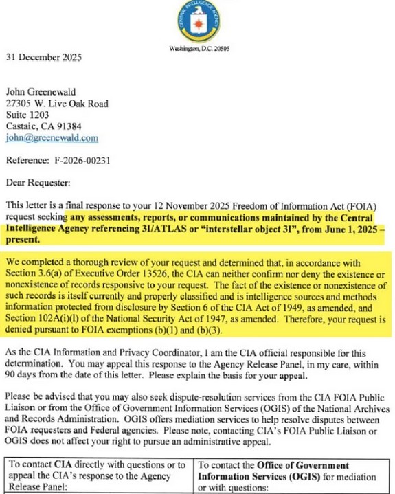 В ответ на запрос в соответствии с Законом о свободе информации (FOIA) от ноября 2025 года, касающийся предполагаемой кометы, ЦРУ заявило, что не может «ни опровергнуть, ни подтвердить существование или отсутствие записей» о 3I/ATLAS.