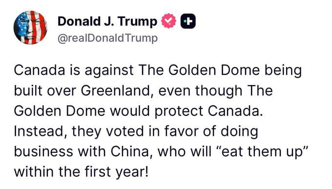 Трамп утверждает, что Канада выступает против строительства системы ПРО “Золотой купол” над Гренландией, предпочитая вместо этого сотрудничество с Китаем.