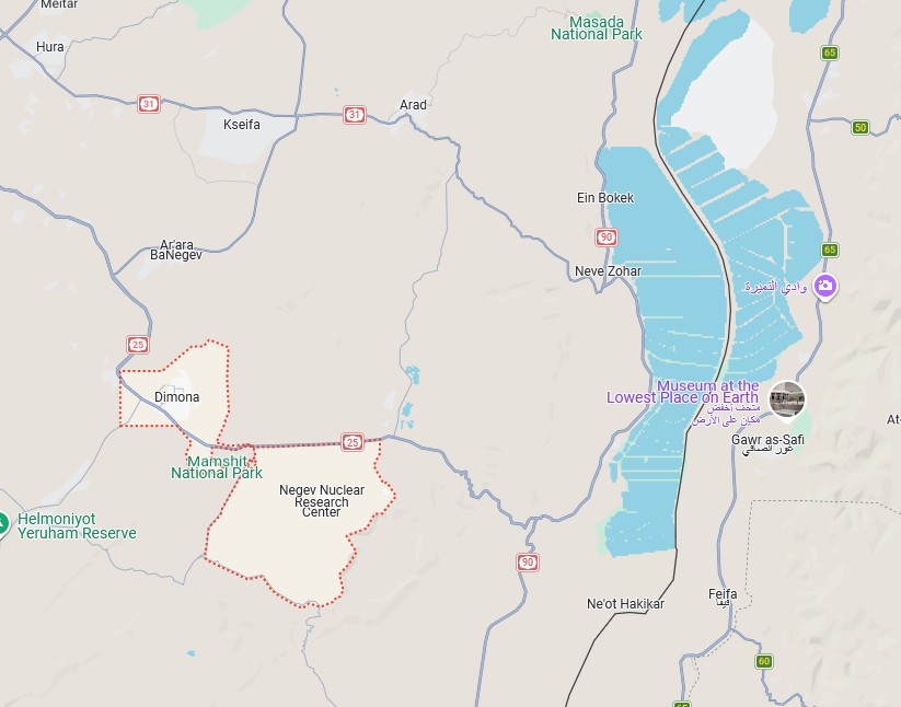Если внимательно посмотреть на карту USGS, то там видно славный город Димона, рядом с которым у Израиля огромный ядерный центр, а само место, где бахнуло – полностью пустынное, там горы и небольшая дорога в эти горы: