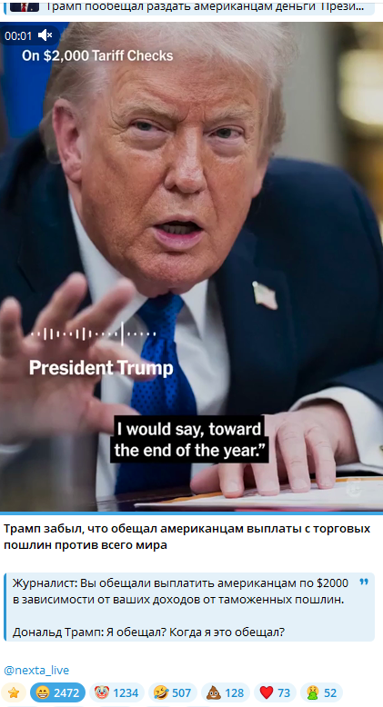 Трамп действительно публично «забыл» о своём громком обещании (пост 8.11.2025), что вызвало волну критики со стороны оппонентов, обвинивших его в популизме и попытке подкупа избирателей перед выборами 2026 г.