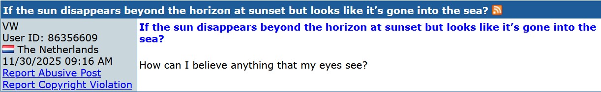 Сегодня какой-то пользователь GLP из Голландии, предположительно один из культистов Плоской Земли, сообщил братьям по вере, что по ходу заката Солнце погрузилось прямо в море и чувак просто не мог поверить своим глазам.