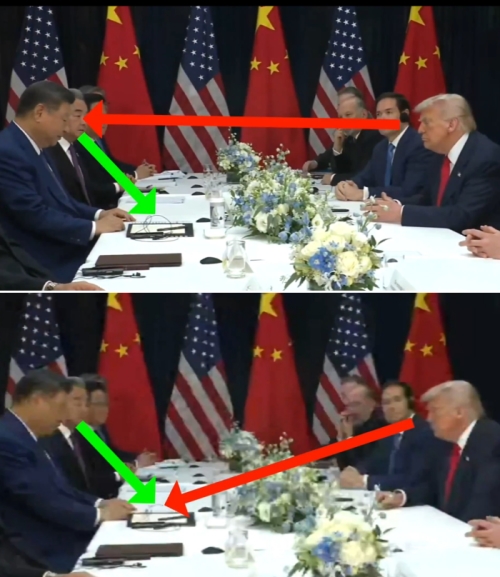 Чем-то аналогичным время от времени занимается и китайская журналистка Jennifer Zeng, которая тоже все смотрела и смотрела на эту встречу, но так и не увидела, чтобы товарищ Си посмотрел в глаза Дональду Трампу. Он все время пялился к себе в блокнот и старательно избегал взгляда американского президента. Что это значит?