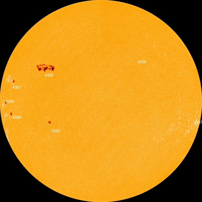 В третьих, пятно 4366 пока не вышло на прямую линию с Землей, это произойдет только завтра/послезавтра: