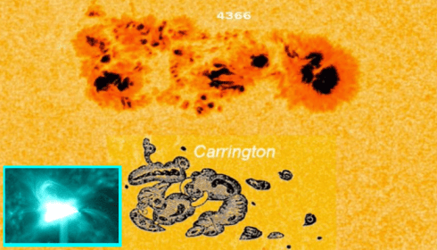 Обычно, когда то или иное пятно достигает 70-80% размеров пятна Кэррингтона, космонавты пугаются. А тут сейчас это великое пятно Кэррингтона не добирает и 70% пятна 4366! Есть от чего испугаться, не побоимся этого слова, до уср-чки.