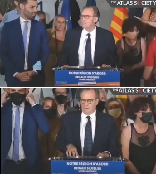 Это ролик с телевидения Франции, фрагмент официального выпуска, не пошедший в эфир. В нем собравшиеся перед телевидением начальники весело смеются и никто даже не думает носить маски. Но, когда режиссер включает обратный отсчет до эфира, вся тусовка клоунов тут же облачается в намордники и объявляет что-то про изоляцию.