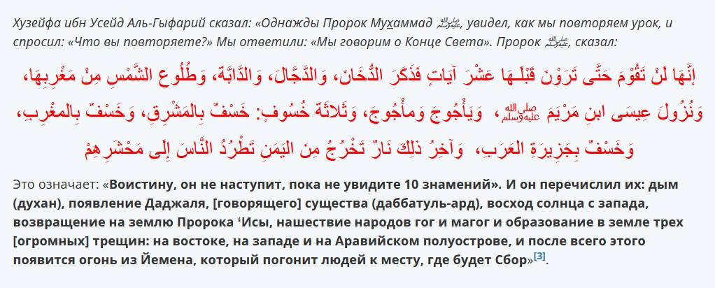 Таким образом мусульманские эсхатологи говорят, что одним из знамений Конца Света будет восход Солнца на Западе.