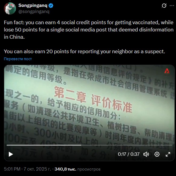 За донос на соседа будут платить 20 социальных кредитов, что довольно много. Так за прививку от ковида дают 4 кредита, а за плохой пост о товарище Си в социальных сетях забирают 50 кредитов. Ни одна диссидентская ж-па такой добычи ресурсов не выдержит: