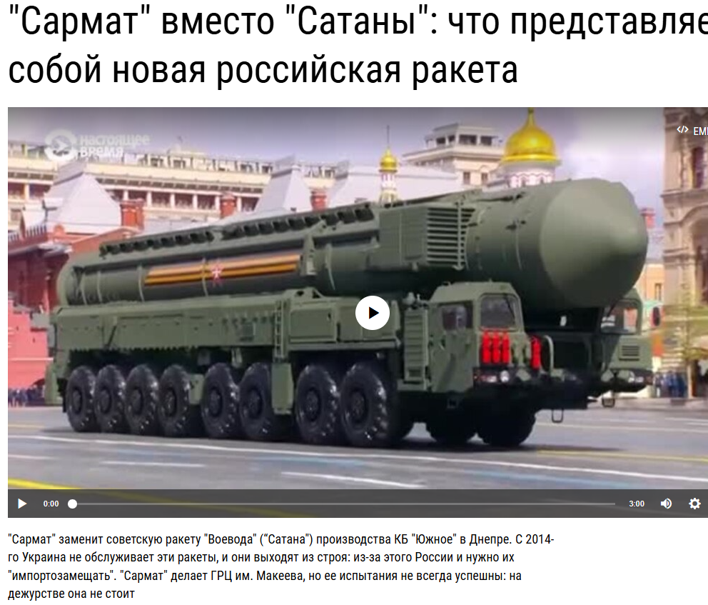 Ракеты Р-36М2 «Воевода» (SS-18 Satan), несущие по 10 боеголовок, созданы КБ «Южное» и заводом «Южмаш» (Днепр). россия утратила технологии и цепочки для их производства.