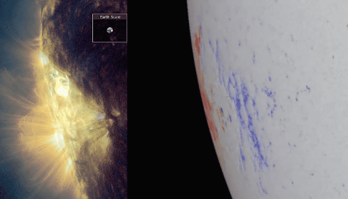 Сейчас ничего подобного не наблюдается, активность AR 4323 умеренная, а точную конфигурацию магнитных полей можно будет посмотреть только когда пятно полностью выйдет из-за горизонта и повернется к нам в более или менее прямой проекции.