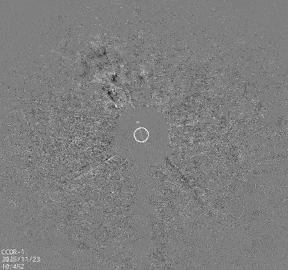 И солнечное пятно не разочаровало, породив за 9 дней 5 вспышек класса X: X1.8, X1.7, X1.2, X5.1 и X4.0. 1, после чего снова скрылось за солнечным горизонтом и продолжая постреливать в пределах X1 – Х2. Однако 26 ноября там было так: