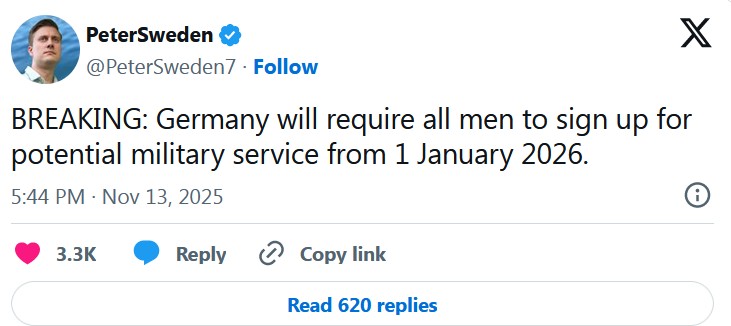 Комментарий Редакции The Big The One: ВВС пишет про 2027-й год, но на самом деле немцев начнут ставить на учет с 1 января 2026-го:
