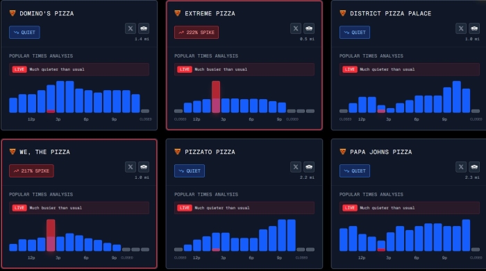 Как можно видеть, “индекс пиццы для Пентагона” находится в желтой зоне, то есть заказы резко подпрыгнули (во*нные всю ночь заседали и кушали):