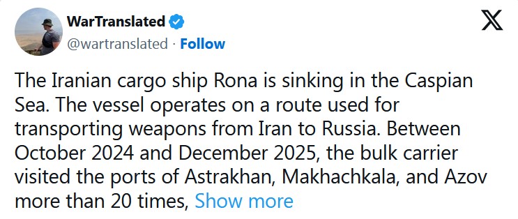 Иранское грузовое судно «Рона» тонет в Каспийском море. Судно курсирует по маршруту, используемому для перевозки оружия из Ирана в Россию. В период с октября 2024 года по декабрь 2025 года балкер более 20 раз заходил в порты Астрахани, Махачкалы и Азова.