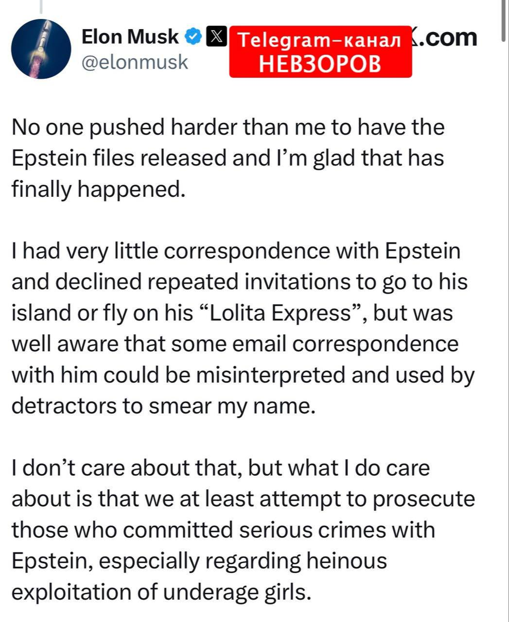 «Никто не добивался обнародования документов Эпштейна так упорно, как я, и я рад, что это наконец произошло. У меня было очень мало переписки с Эпштейном, и я неоднократно отклонял приглашения посетить его остров или полететь на его «Лолита-экспрессе», но прекрасно понимал, что некоторые электронные письма с ним могут быть неверно истолкованы и использованы недоброжелателями для очернения моего имени. Меня это не волнует, но меня волнует то, чтобы мы хотя бы попытались привлечь к ответственности тех, кто совершил тяжкие преступления вместе с Эпштейном, особенно в отношении чудовищной эксплуатации несовершеннолетних девочек.”