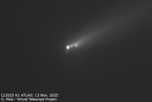Это были первые признаки странных событий. А 12 ноября Джанлука Мази из проекта «Виртуальный телескоп» в Италии снова посмотрел на C/2025 K1 (ATLAS) и обнаружил, что комета раскололась на три части: