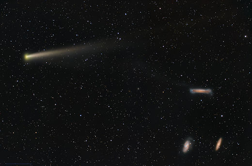 А теперь мы узнаем, что золотая комета — тройная. Вы можете увидеть, как разлетаются ее фрагменты с помощью небольшого любительского телескопа. Комета находится на утреннем небе, недалеко от чаши Большой Ковша. Направьте оптику туда.
