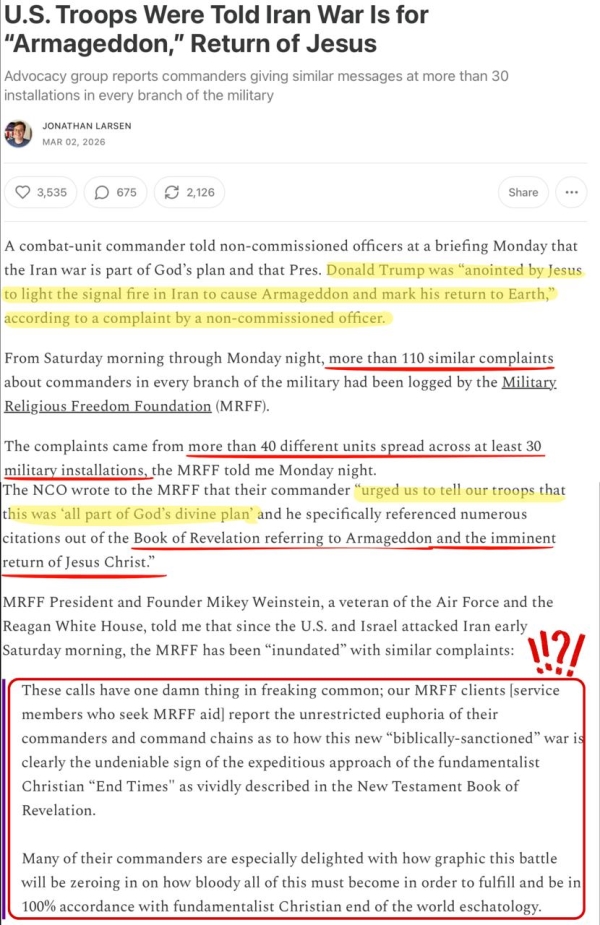 Командиры сообщили американским во*ннослужащим, что Иран — это часть «Армагеддона» и возвращения Иисуса. Правозащитная группа сообщает, что командиры распространяли аналогичные сообщения более чем в 30 воинских частях всех родов войск.