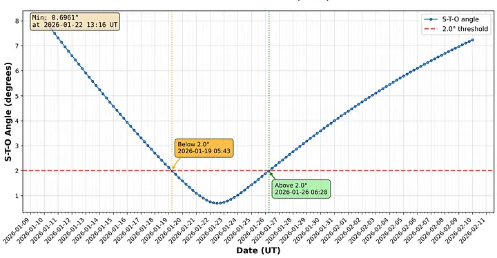 Как вычислил на днях астроном-любитель Mauro Barbieri. 22 января 2026-го года 3I/ATLAS окажется на прямой линии между центром Земли и центром Солнца, отклонение будет около полуградуса: