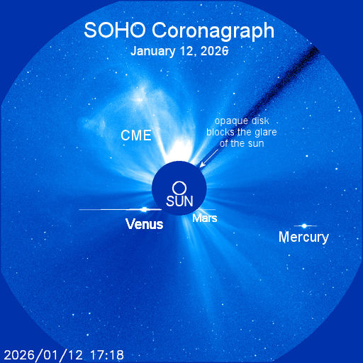 spaceweather.com: В эти дни происходит редкое соединение трёх планет. На этом снимке, полученном с помощью коронографа SOHO 12 января, Венера, Марс и Меркурий сгруппированы вокруг солнечного диска: