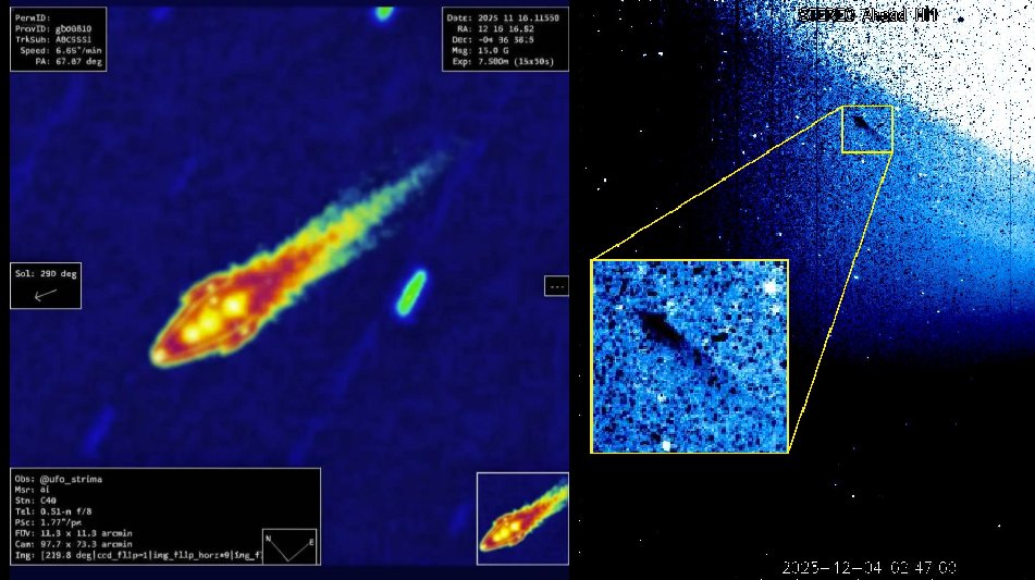 Это два фото 3I/ATLAS, сделанные HiRISE (телескоп на борту Mars Reconnaissance Orbiter) 2 октября и Stereo A HI1, сделанное 4 декабря. На них видно, что возле 3I/ATLAS присутствует некий объект, который никуда не делся за 2 месяца: