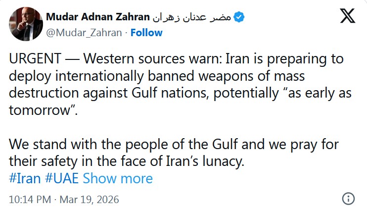 СРОЧНО . Западные источники предупреждают: Иран готовится применить запрещенное на международном уровне оружие массового поражения против стран Персидского залива, возможно, «уже завтра». Мы солидарны с народами Персидского залива и молимся за их безопасность перед лицом безумия Ирана.