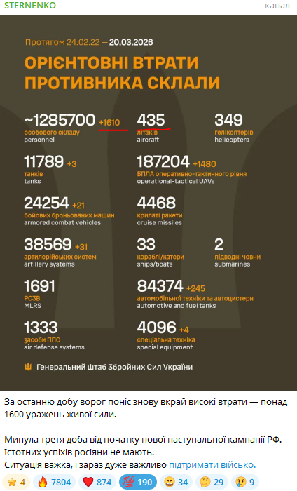 Если мы наложим этот библейский код на сухую статистику Генштаба ВСУ на 20 марта 2026 г., цифры сойдутся до десятых долей процента: