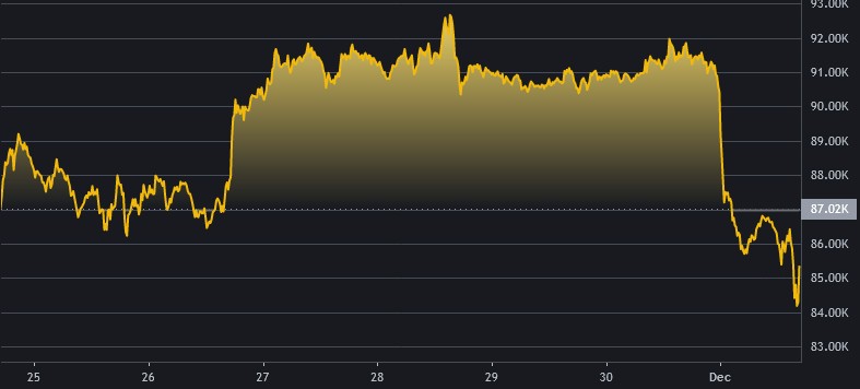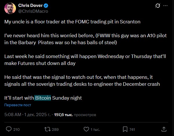 Утром в понедельник, 1 декабря 2025-го года (или вечером в воскресенье по времени США) случилось “невероятное”: резко обвалился биткоин: